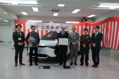 この度、トヨタカローラ京都株式会社様より、実習・公用車両として電気自動車bZ4Xを本校の実習・公用車として貸与いただき、校内にて貸与式を執り行いました