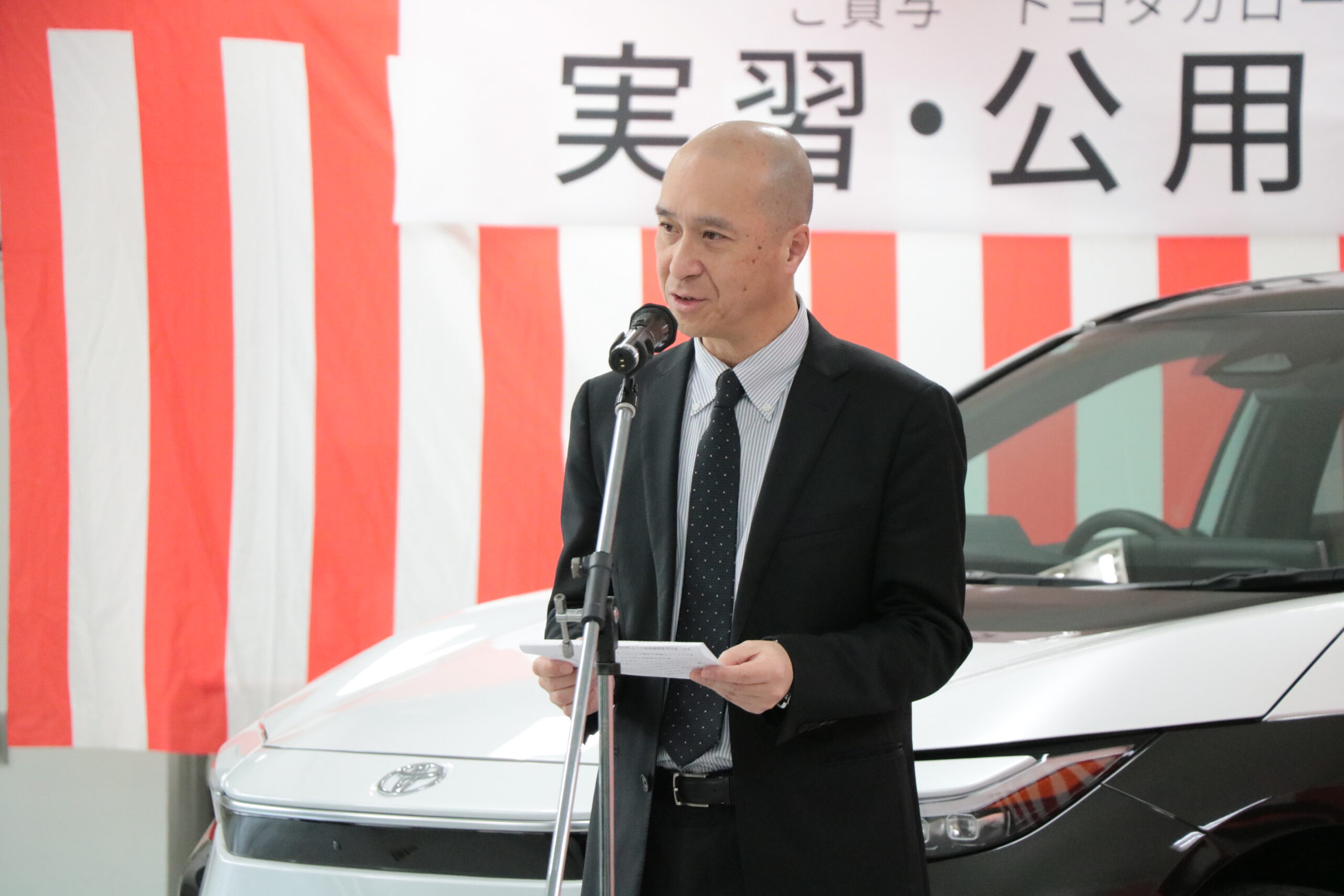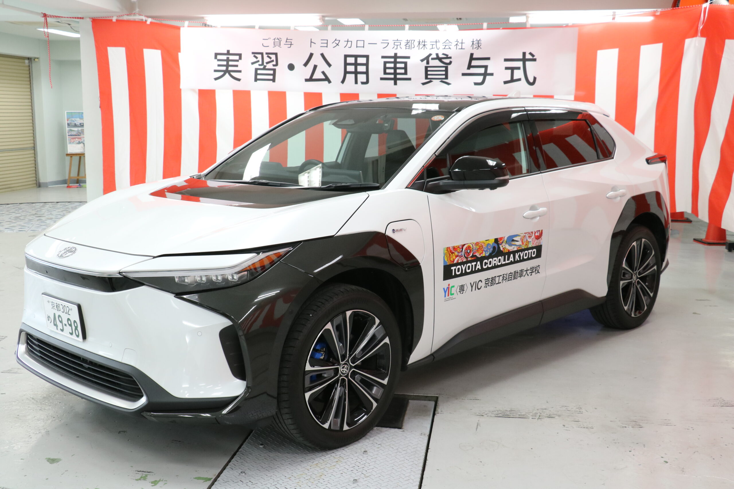 この度、トヨタカローラ京都株式会社様より、実習・公用車両として電気自動車bZ4Xを本校の実習・公用車として貸与いただき、校内にて貸与式を執り行いました