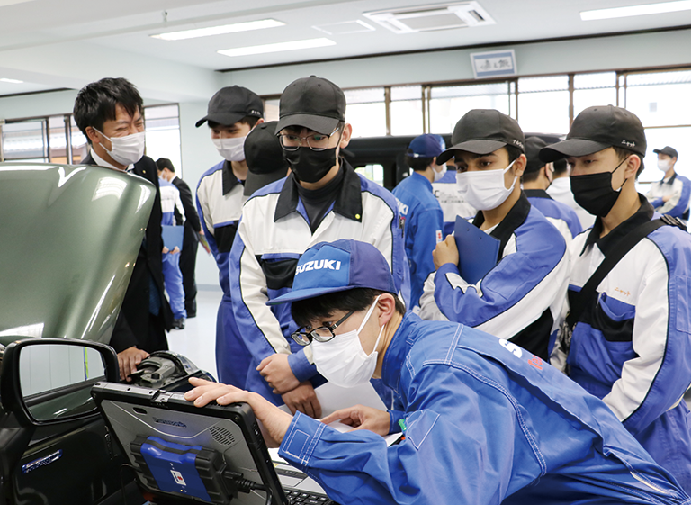 スズキを代表するハスラーやジムニー、スイフトの自動車と、バイクの隼などを搬入いただき、講義していただきました。パソコンと車両をつないでの診断や操作、アプリを使ったさまざまな便利機能を勉強。バイクの実習では、隼と最新のGSX-S1000GTに試乗させていただき、電子制御スロットルシステムやマルチインフォメーションディスプレイなどの最新装備を体感し、学生たちは大興奮でした。現場で活躍する整備士のお話を伺うこともできた貴重な講習でした。